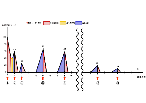 下のグラフは、第1回目の医療レーザー脱毛治療を受けた後、むだ毛総数がどのように変化していくのかについて示したものです。